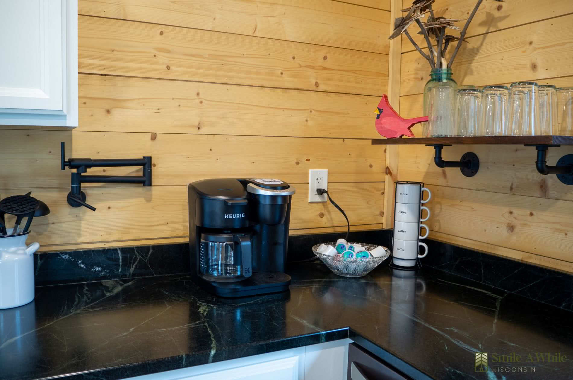 - Coin café et thé : Comprend une cafetière à piston, une machine Keurig et une bouilloire.